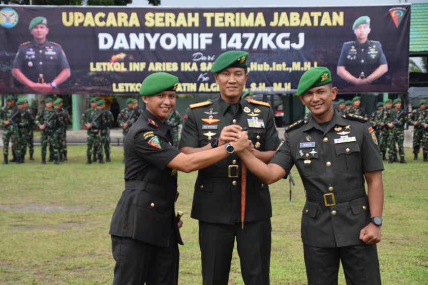 Danrem 045/Garuda Jaya, Brigjen TNI Nur Wahyudi, S.E., M.H., M.I.Pol, memimpin upacara serah terima jabatan (Sertijab) Komandan Batalyon Infanteri (Danyonif) 147/KGJ dari Letkol Inf. Aries Ika Satria, S.HUB.INT., M.H.I. kepada Letkol Inf. Matin Algiffari, S.H., M.H. Kegiatan berlangsung di Lapangan Upacara Yonif 147/KGJ, Kecamatan Namang, Kabupaten Bangka Tengah, Sabtu (10/1/2026).