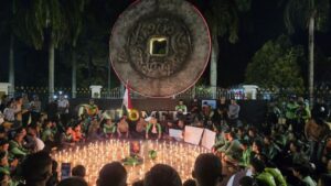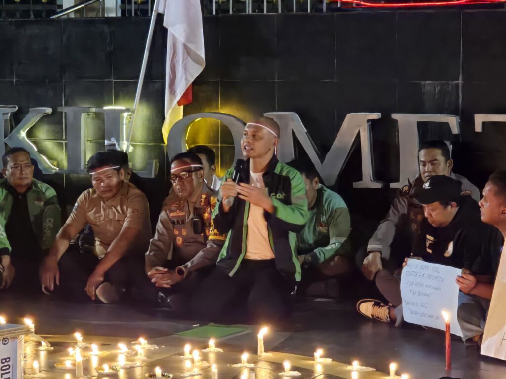 Mengenakan motor dan jaket berwarna hijau khas para driver ojol, Kapolda langsung berbaur mengikuti aksi damai solidaritas 1000 lilin sekaligus doa bersama untuk almarhum Affan Kurniawan.