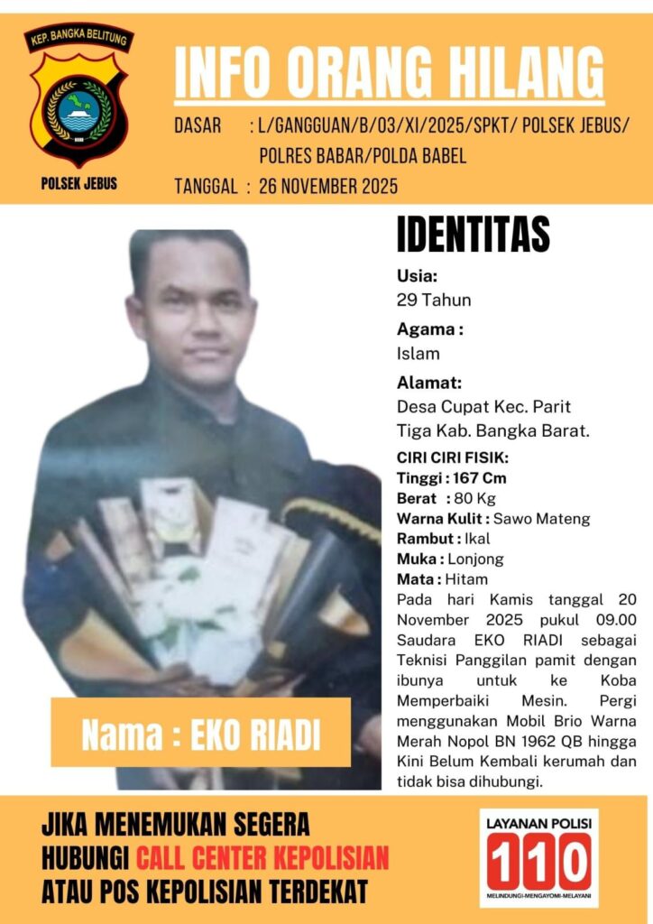“Sejak laporan masuk, personel Polsek Jebus bersama Polres Bangka Barat langsung melakukan penyisiran rute yang diduga dilalui korban, pengecekan ke lokasi-lokasi yang relevan, serta koordinasi lintas wilayah. Kami bekerja penuh untuk membantu menemukan keberadaan Saudara Eko Riadi,” jelas Iptu Yos Sudarso.